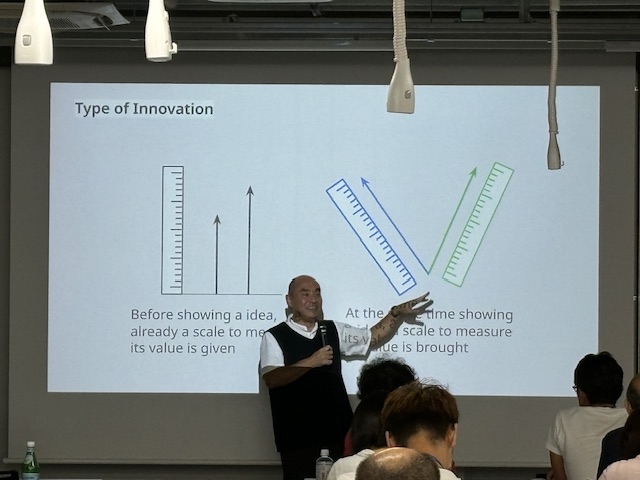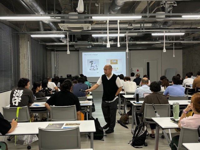 前半は、システムプランニング(小野健太:教授/システムプランニング研究室)の講義 「デザインとアートの違い」「デザインとエンジニアの違い」 デザインと近似するキーワードからデザインの本質を探っていく内容で、受講者に質問を投げかけながら、講義が進みました。